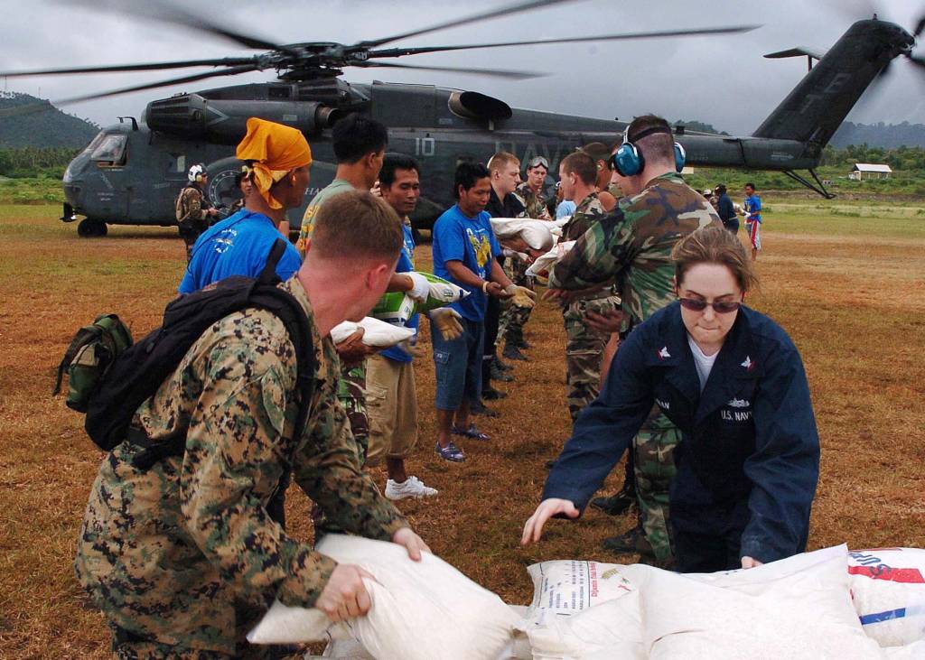 Sabang, Indonésie (24. ledna 2005) – Nakládání pytlů s rýží do vrtulníku. Vrtulníky z Mine Countermeasures Squadron One Five (HM-15) and Helicopter Combat Support Squadron Five (HC-5) denně dodávaly jídlo do oblastí postižených tsunami z 26. prosince 2004. Foto U.S. Navy, Stephanie Lynne Johnson. Originál zde. Více fotografií a alespoň krátké pojednání o účasti U.S. Navy na pomoci po tsunami zde, strana 20-29.