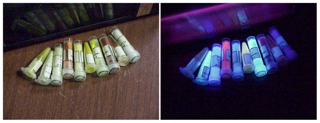 Když na nějakou látku dopadá světlo vhodné vlnové délky, barvy, je pohlceno. Jeho energie se ale neztrácí a způsobí přechod atomů či molekul látky na vyšší energetickou hladinu. Po jisté době se tento přebytek energie znovu vyzáří na jiné, delší vlnové délce. Na obrázku vpravo vidíte příklad, kdy na vzorky různých látek dopadá neviditelné ultrafialové záření a ony vyzařují viditelné světlo krásných barev.